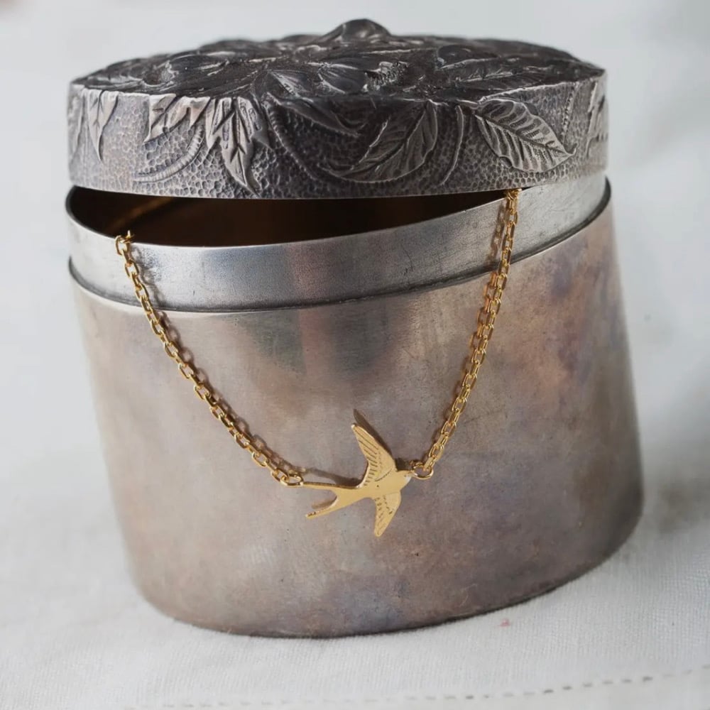 Handmade by Lincoln based designer Amanda Coleman. A delicate Silver Swallow plated with 22ct Gold on a 17” Chain.