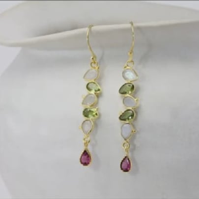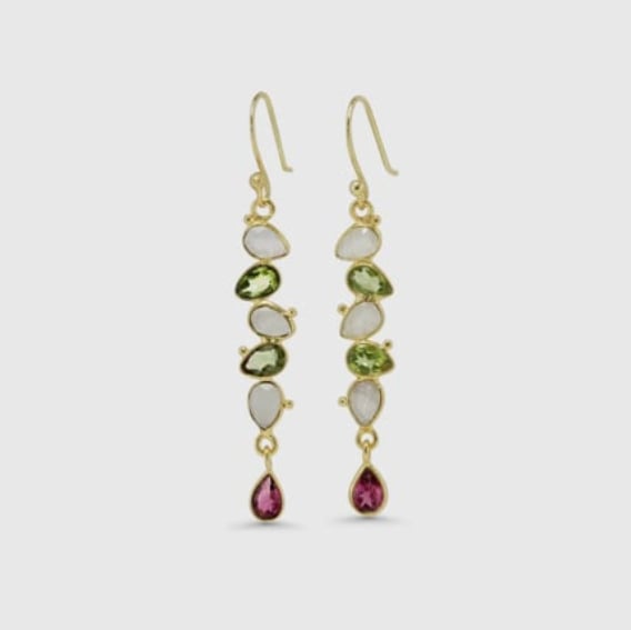 A handmade pair of gold vermeil and Peridot, Moonstone & Tourmaline earrings by Devon based Guest Designer Banyan.