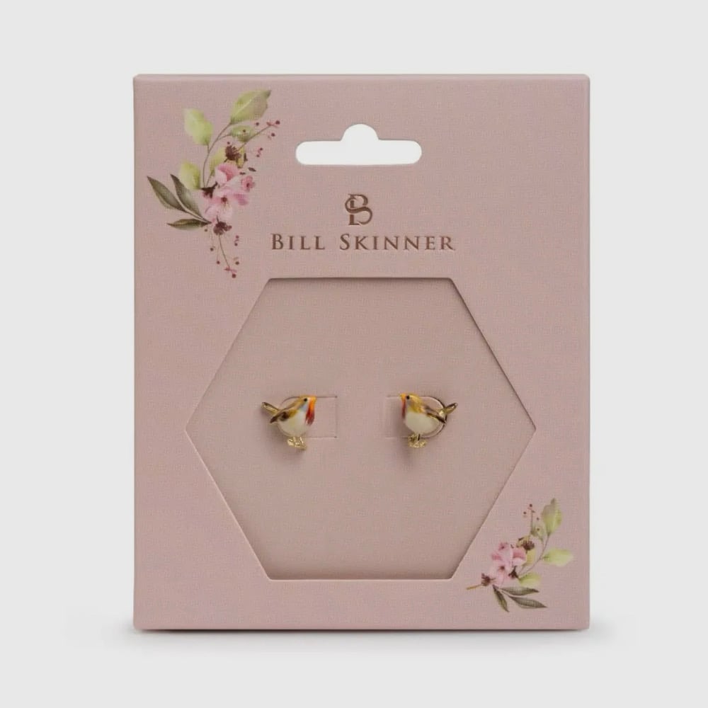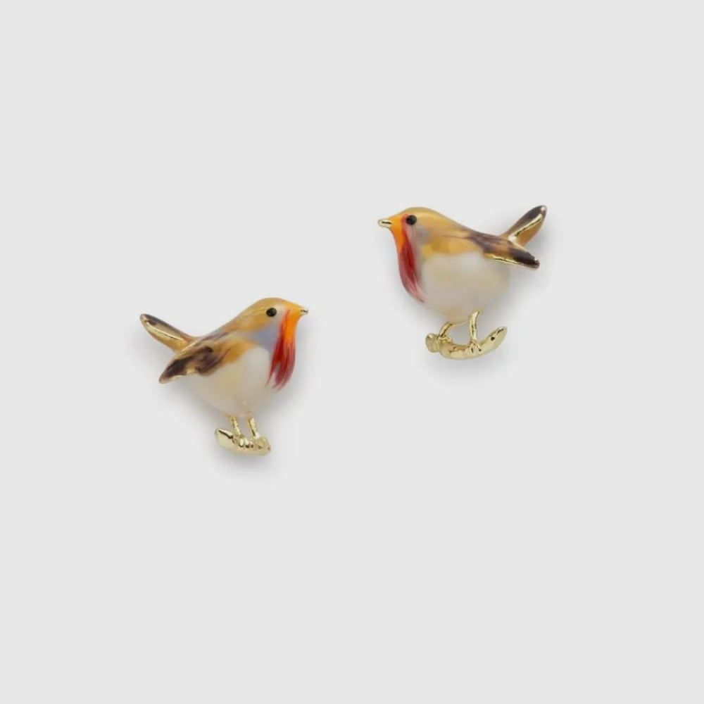 Beautiful enamel-painted Robin earrings, designed by Bill Skinner.
