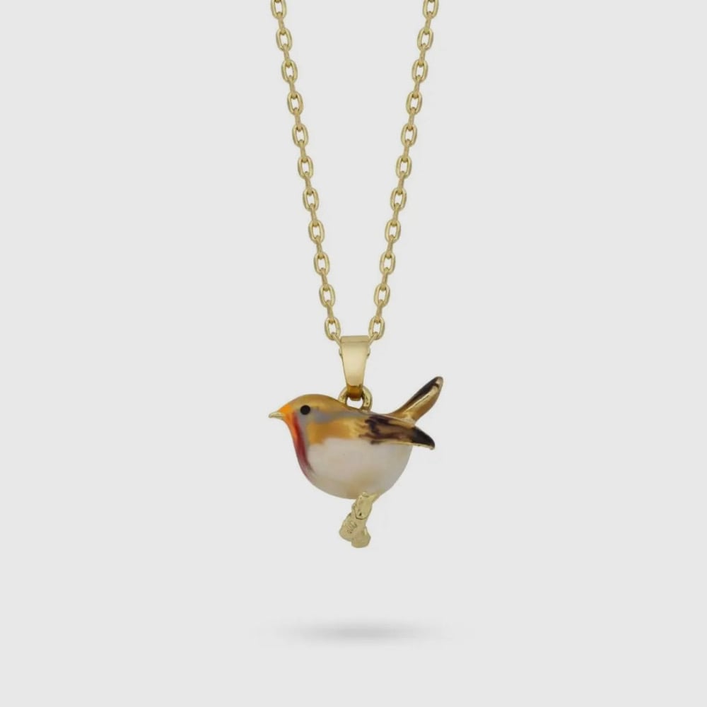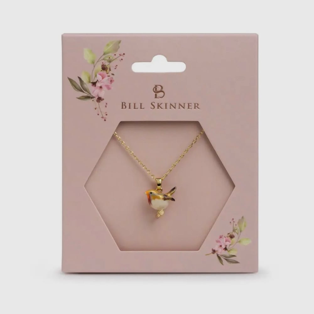Beautiful enamel-painted Robin Necklace, designed by Bill Skinner.