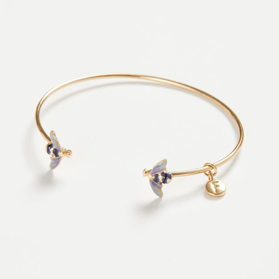 A delicately carved, engraved and hand-painted with enamel bees adorn each end of an open gold-plated brass bangle, which is adjustable to fit any wrist size.