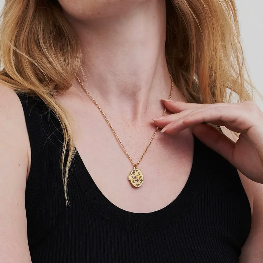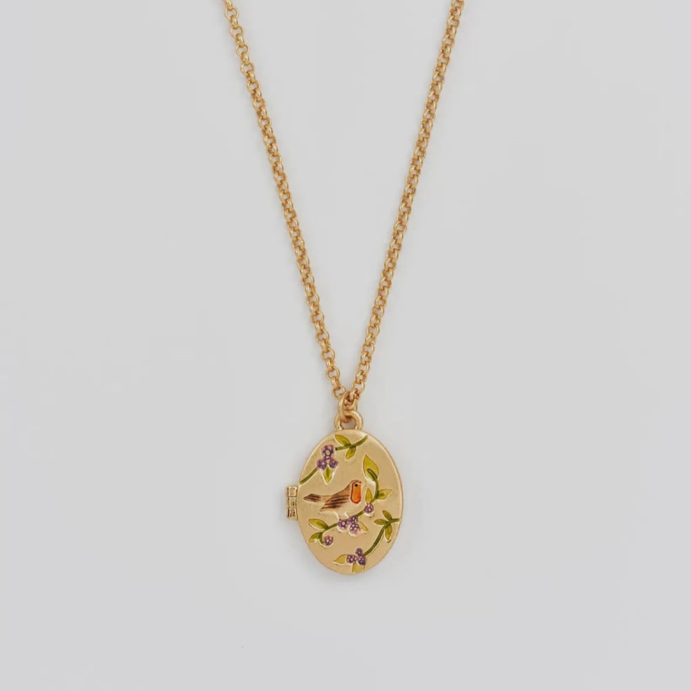 Delicately engraved and hand-painted enamel Robin and Blackberry Locket on 14ct gold plate.