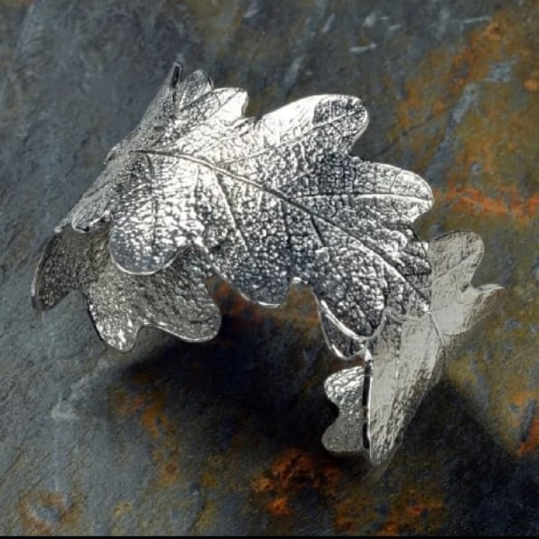 3 beautifully textured oak leaves overlap to create a stunning pewter oak leaf cuff bangle or bracelet gift, for anyone who loves big, but delicate, jewellery. This fabulous silver coloured oak leaf cuff looks great with our matching oak leaf necklace. The Oak tree symbolises: stability, hospitality, strength, honour, eternity, endurance & liberty.