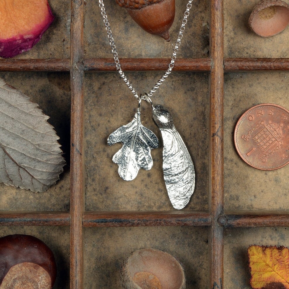 A delicate and detailed pewter oak leaf and sycamore key necklace on an 18" Sterling silver chain. Oak and sycamore jewellery gifts.