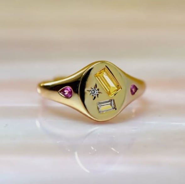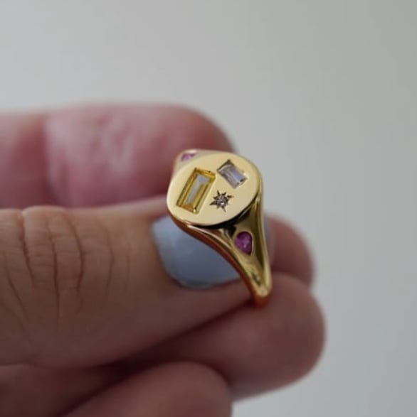 A multi-jewelled adjustable Signet Ring featuring a Kaleidoscope of irregular Gemstones, plated in 14ct Gold by Guest Designer Junk Jewels.