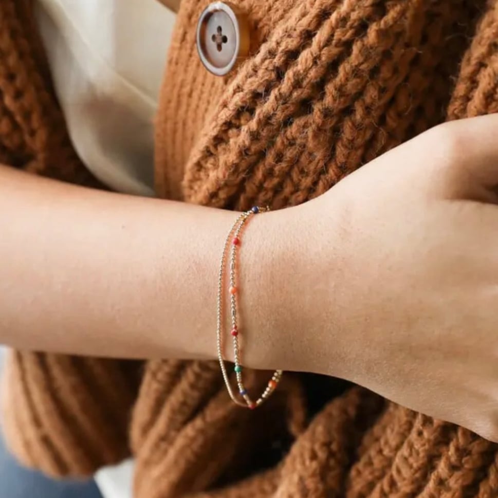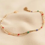 The bracelet consists of two 14ct gold plated chains, one of which is a tiny gold ball chain, and the other a ball chain with interspersed enamel beads in rainbow colours.