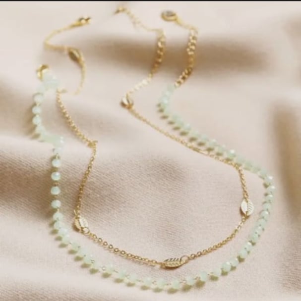 A set of 2 Necklace featuring green faceted beads and a 14ct Gold plated Leaf Chain by Guest Designer Lisa Angel.
