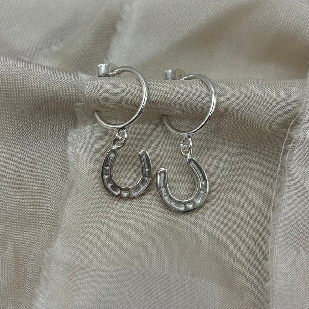A beautiful pair of Silver Half Hoop Earrings with Lucky Horseshoe Charms adorned with 7 hearts and stars.