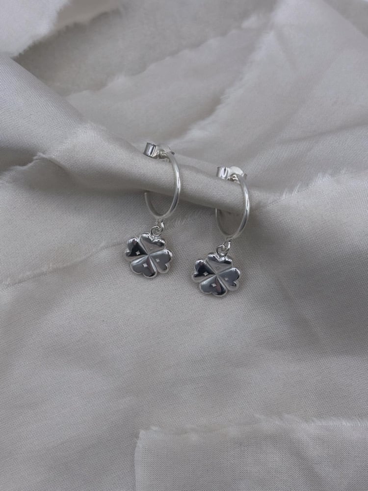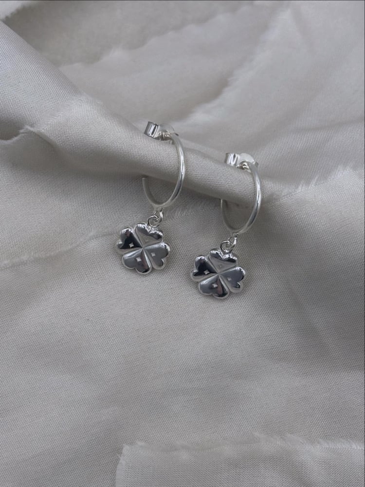 A beautiful pair of Silver Half Hoop Earrings with Four Leaf Clover Lucky Charms made up of 4 hearts, adorned with stars.