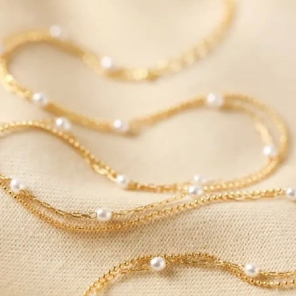 A 14ct gold plated necklace consists of a double chain, featuring tiny pearls. Fastening simply via a lobster clasp and extender chain, this gorgeous necklace is the perfect piece for layering up with other stylish chains.